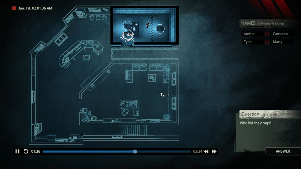 画面には、建物の見取り図と、丸いアイコン(人物)が表示されているだけ。 プレイヤーは「過去の音」を聞く能力を使い、犯行時刻の現場で何が起きていたのかを盗聴(ヒアリング)する。 「リビングで口論している間に、キッチンで誰かが毒を入れた音」など、同時多発的に進む会話を行き来し、誰が誰なのか、何をしたのかを特定する。 視覚情報がないからこそ、足音や衣擦れの音といった細部に意識が研ぎ澄まされる、没入感の高い聴覚ミステリー。