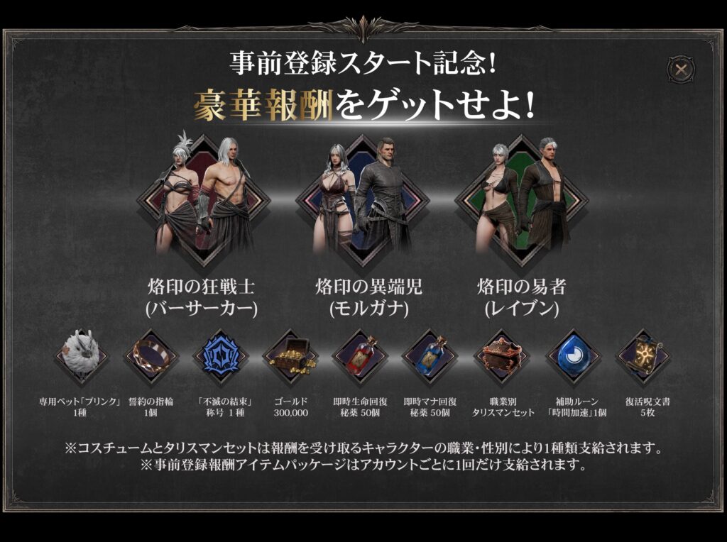 現在、2026年1月20日のサービス開始に向けて事前登録を受け付けています。登録者全員には、各職業別の専用コスチューム(「烙印の狂戦士」など)や、専用ペット「プリンク」、さらにはゴールドや回復秘薬といった多数の豪華特典が配布されます。