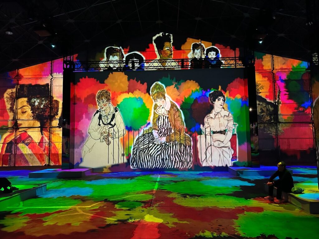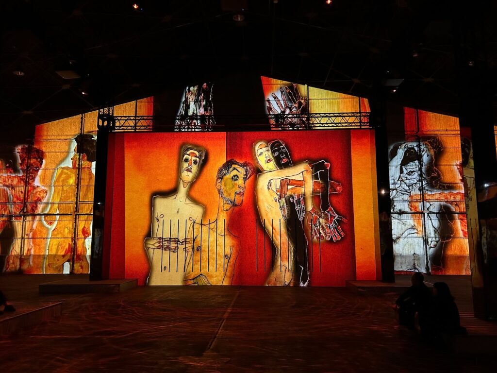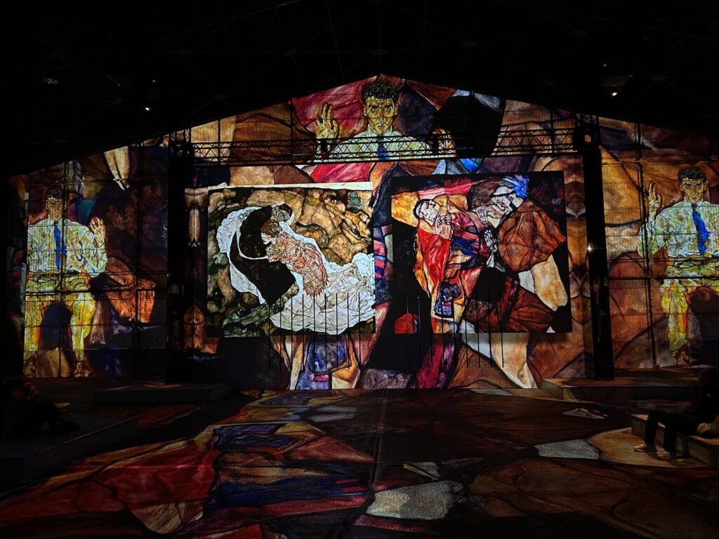 巨大なスケッチが投影される空間には、爆発寸前の感情が凍りついたような緊張感が漂います。クリムトが黄金で人間を包み込んだのに対し、シーレはその繭を破り、生身の感情を露出させました。この 「光」と「影」 の対比こそが、本展の最大の見どころです。